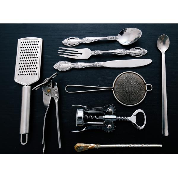 Kitchen Utensils : Pots, pans, knives, chopping boards.