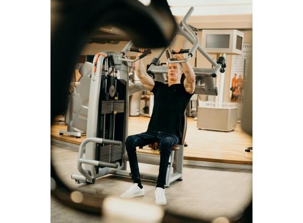 Fitness Center : Weight racks, cardio machines, yoga equipment.