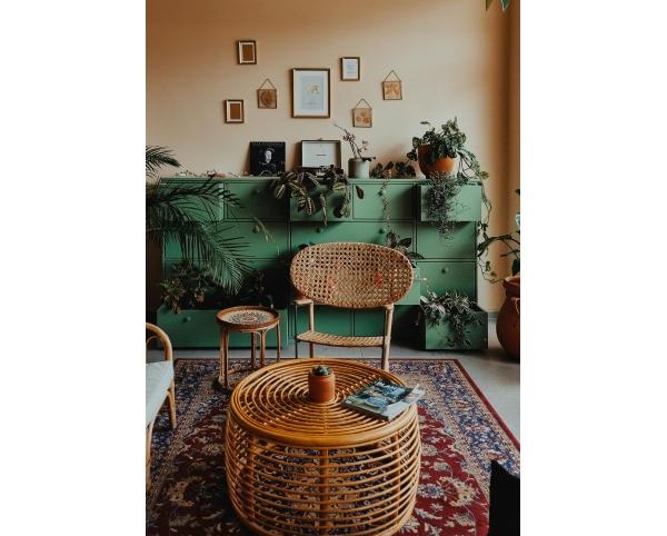 Area rugs, sculptures, vases, decorative plants, artwork.